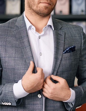 4. Do saka musíte vklouznout jako pod peřinu. Nesmí vás nikde táhnout a vyvracet vám při oblékání ramena. Dbejte také na to, aby vám nepřečnívaly ramenice saka přes hranu ramene.
